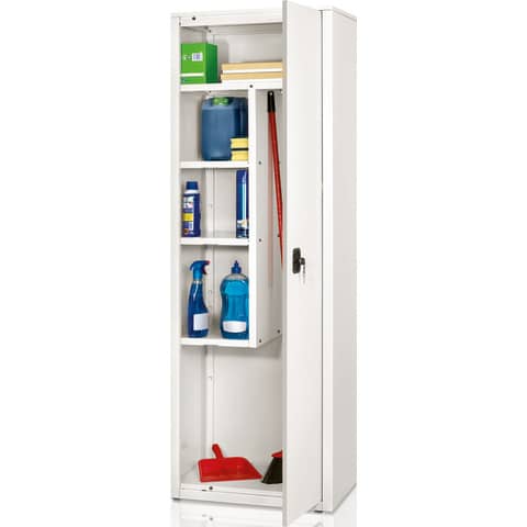 Armadio multiuso a una porta battente, con divisione verticale e vano portascope, dimensioni 60x41xH.181,5 cm. Armadio in robusta lamiera d’acciaio elettrozincato, spessore 8/10. Una porta con serratura con chiusura sottopiano con ripiani fissi e serratura dotata di 2 chiavi. Dotato di 1 tramezza, 3 ripiani corti e un ripiano lungo, più lungo vano portascope. Su piedini regolabili per adattarsi a ogni pavimento.