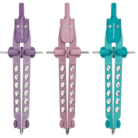 Compasso a regolazione rapida dal design 3D per la scuola e lo studio. Per cerchi fino a – 340 mm con rotella centrale dello stesso colore. Comprende scatola con pezzi di ricambio e mine. Made in Germany. Confezione da 3 pezzi.