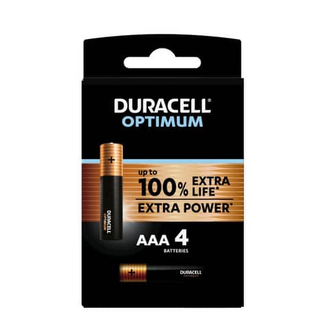 Batteria Alcalina AAA ministilo Optimum: extra durata ed extra potenza. Ciascun Blister contiene 4 batterie. Duracell Optimum dura più a lungo in alcuni dispositivi come i giocattoli. Duracell Optimum offre più potenza rispetto alle precedenti batterie alcaline Duracell per far funzionare meglio i tuoi dispositivi.