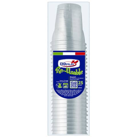 Bicchieri realizzati in polistirene Diamant. Capacit?: 600 ml. Colore neutro trasparente. Diametro superiore: 98 mm. Diametro inferiore: 62 mm. Altezza: 131 mm. Peso netto unitario: 13 grammi. Adatti al contatto con alimenti: fino a una temperatura massima di 90 °C per 15 minuti. Non utilizzabili in forno. Sono riutilizzabili, testati per resistere fino a 20 lavaggi in lavastoviglie. Confezione composta da 25 pezzi.
