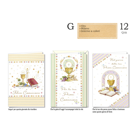 Biglietti augurali assortiti in 3 soggetti oro con stampa in rilievo e interno colorato. Confezione composta da 12 biglietti. Ideali per augurare una felice Comunione.