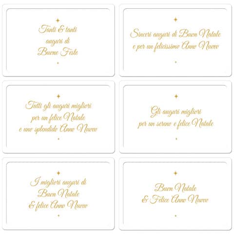 Biglietti Natalizi in vassoio, in cartoncino bianco con busta e scritta oro. Formato 9×14 cm, confezione da 6 pezzi.