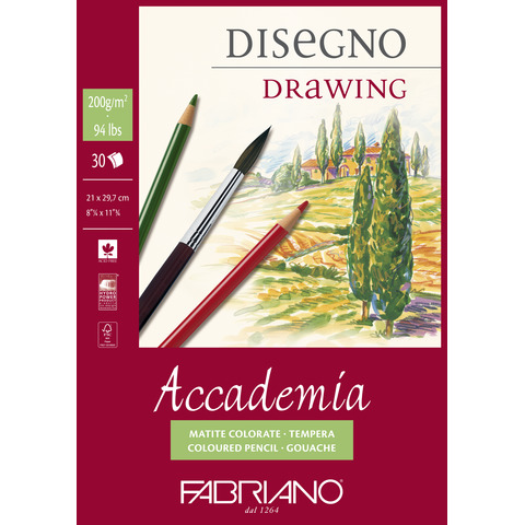 Blocco da disegno linea Accademia, collato in testa prodotto con il 100% di cellulosa ECF, certificata FSC secondo rigorosi standard ambientali, sociali ed economici. Idoneo per carboncino, matita, pastello, sanguigna. Formato A4, blocco da 30 fogli.