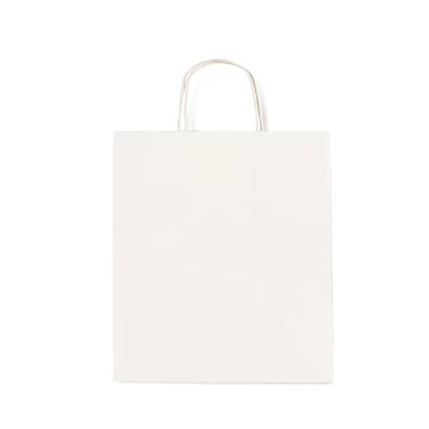 Borsa Allegra neutra kraft bianca con manici in carta ritorta. Dimensioni: 54x14x50 cm. Confezione da 25 pz. Grammatura: 110 gr/mq.