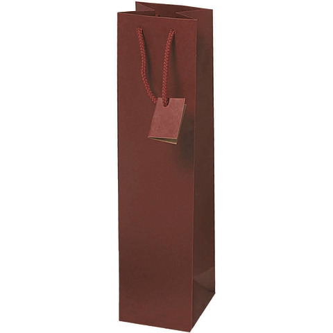 Borsa portabottiglie realizzata in carta kraft da 210 g/m² con manico in cotone e tag. Dotata di soffietto sia laterale sia sul fondo. Ha dei listelli di rinforzo e il cartoncino sul fondo – rigido. Dimensioni: 10+9 x H.39 cm. Colore bordeaux. Ideale per regalare bottiglie, quali: vino, olio oppure liquori. Confezione composta da 10 pezzi.