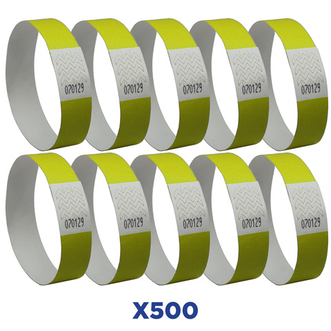 Braccialetti identificativi realizzati in?Tyvek?, materiale composto da fibre di polietilene ad alt? densit? (HDPE). Perfetti per eventi pubblici e sportivi. Il materiale resistente, morbido e antistrappo li rende un accessorio indispensabile per identificare i partecipanti agli eventi. Resistono all’acqua e agli strappi. Sistema di chiusura adesivo adattabile a tutte le taglie di polso. Disponibili in diversi colori per diversificare i partecipanti agli eventi. Colore giallo fluo. Confezione composta da 500 pezzi.