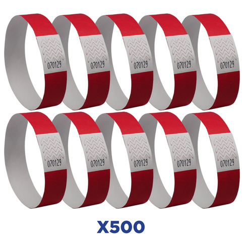 Braccialetti identificativi realizzati in?Tyvek?, materiale composto da fibre di polietilene ad alt? densit? (HDPE). Perfetti per eventi pubblici e sportivi. Il materiale resistente, morbido e antistrappo li rende un accessorio indispensabile per identificare i partecipanti agli eventi. Resistono all’acqua e agli strappi. Sistema di chiusura adesivo adattabile a tutte le taglie di polso. Disponibili in diversi colori per diversificare i partecipanti agli eventi. Colore rosso fluo. Confezione composta da 500 pezzi.