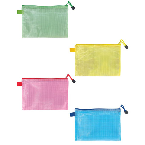 Busta chiusura a zip con cordino colorato. Realizzato in PP e rete nel formato 33×23 cm. Assortita in 4 colori.