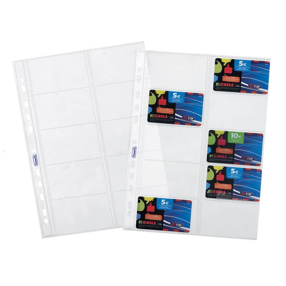Buste Favorit porta card e schede telefoniche confezione da 10 pezzi a foratura universale in polipropilene, formato interno 8,5×5,4(x10), finitura liscia. Formato esterno busta 21,5×30,5 cm, formato busta 22×30 cm.