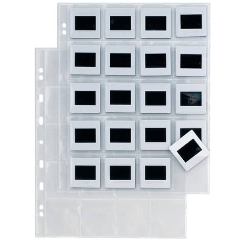 Buste porta diapositive in PP liscio con foratura universale, dotate di 20 spazi (5,5×5,5 cm). Fomato busta 22×30 cm.