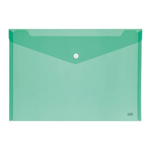 Busta trasparente in PP con chiusura a bottone. Confezione da 12 pezzi in 4 colori assortiti: trasparente neutro, giallo, blu e verde. Formato A5, apertura orizzontale.