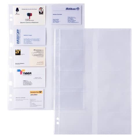Buste trasparenti in polipropilene liscio ad alto spessore con foratura universale. Dotate di 10 spazi di formato 90×55 mm, adatti a contenere biglietti da visita o schede telefoniche. Formato A4.
