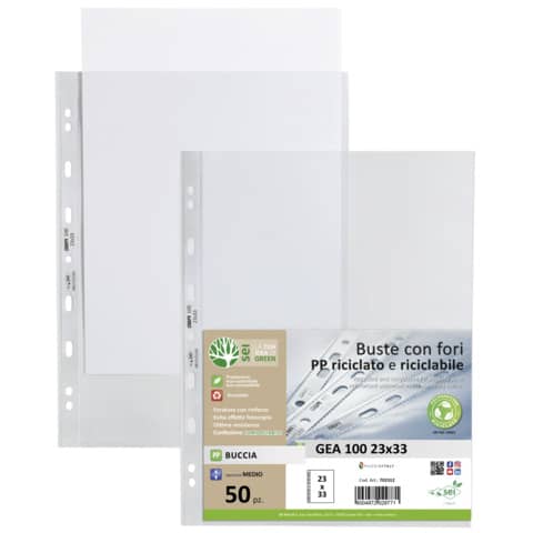 Buste in polipropilene finitura buccia d?arancia, riciclato e riciclabile, con foratura universale rinforzata. Spessore medio. Confezione compostabile al 100%. Ideali per archiviare qualsiasi tipo di documento, con un particolare pensiero alla sostenibilità . Formato: 23 x 33 cm. Formato utile: 22 x 30 cm. Confezione da 50 pezzi.