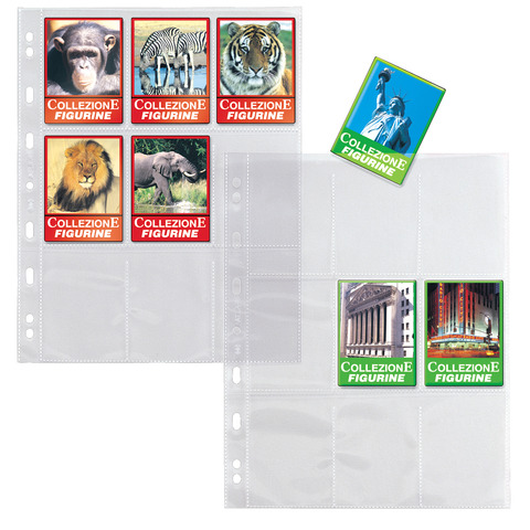 Set di 9 interni a perforazione universale in polipropilene liscio ideali per la raccolta di figurine. Ogni interno ha 9 tasche di formato 6,5×9 cm.
