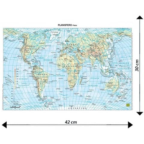 La carta scolastica da banco del Mondo in formato A3 – stampata su entrambi i lati. Un lato rappresenta l?aspetto fisico della terra su un lato e quello politico dall?altro. L?uso dei colori – bilanciato per salvaguardare sia la brillantezza che la leggibilit? della carta. Le città si distinguono per grandezza con una simbologia appropriata. Nella parte fisica emerge la conformazione dei sistemi montuosi e dei fondali marini grazie a una scala di colori armonica che non disturba la leggibilit?. Plastificata per fornire la massima protezione, – economica e duratura, ideata specificatamente per l?uso nelle scuole. Carta da banco del Mondo, formato 42 x 30 cm (A3).