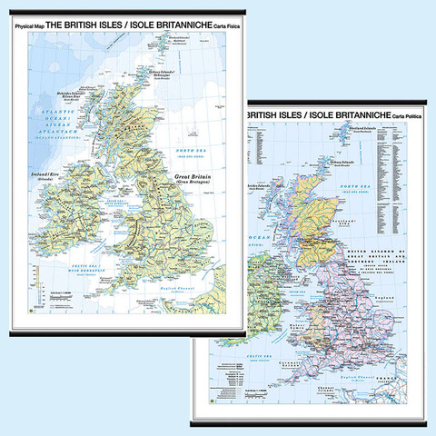 Brithis Isles (Isole Britanniche) sono carte murali scolastiche per la didattica realizzate da Belletti. La carta politica rappresenta con chiarezza la suddivisione amministrativa utilizzando diversi colori per l?individuazione degli stati e grandi caratteri ben leggibili per i toponimi. Indica i nomi dei Lander, delle regioni, delle capitali e delle principali città con una chiara indicazione del numero di abitanti (suddivisione a fasce). La carta fisica rappresenta tutta l?idrografia e l?orografia con l?utilizzo di tinte per le quote altimetriche e gradazioni di azzurro per le batimetrie. Sono indicati i nomi dei monti, delle catene montuose, delle regioni fisiche, delle valli, pianure, altopiani e depressioni. Grazie alla speciale plastificazione opaca antiriflesso – garantita un?ottima leggibilit? in ogni condizione di luce. Appendere o ruotare la carta per accedere alla seconda cartografia – semplice grazie alle speciali aste di sostegno in PVC con pratici anelli di fissaggio. Formato: 97 x 134 cm. Made in Italy.