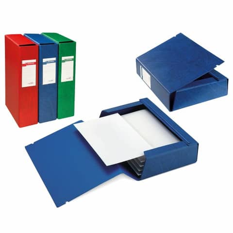 Cartelle in Colpan (cartone rivestito in PVC) con chiusura a tre lembi con elastico. Dotate di portacartellino con etichetta intercambiabile.