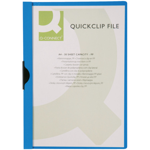 Cartellina con clip realizzata in robusto PVC. Capacit? 30 fogli formato A4. Fronte trasparente e retro colorato, clip in metallo nero. Colore: blu.