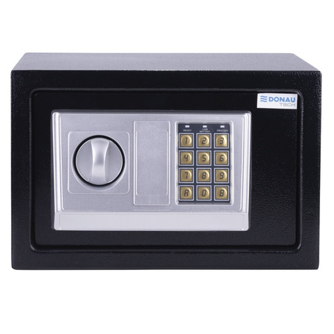 Cassaforte manuale-digitale. Mettete al sicuro i vostri oggetti di valore con la cassaforte Donau Tech, che combina tecnologia moderna e affidabilità . Ideale per alberghi, uffici e case. Permette di programmare un codice da 3 a 8 cifre. Dopo tre tentativi errati la cassaforte si blocca automaticamente. Sono incluse due chiavi per l’apertura manuale. Fori preforati all’interno della cassaforte e viti di fissaggio per il montaggio permanente su qualsiasi superficie. Certificazione CE e RoHS. Dimensioni (L x P x A): 310 x 200 x 200 mm. Colore: nero.
