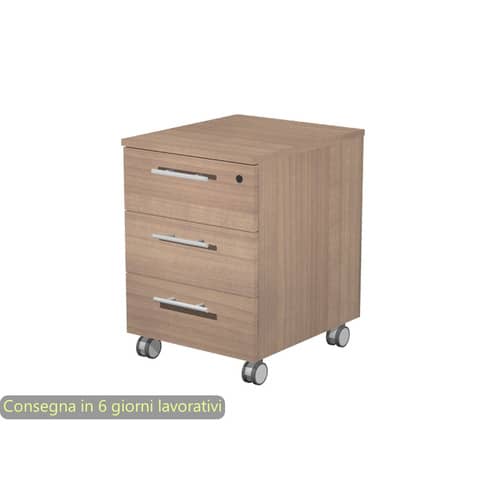 Top, base, fianchi e frontalini di spessore 18 mm. Dietro di spessore 10 mm. Cassetti con maniglie in metallo e guide metalliche con fermo a fine corsa. Completa di serratura sul primo cassetto e ruote pivotanti, montate e con freno.