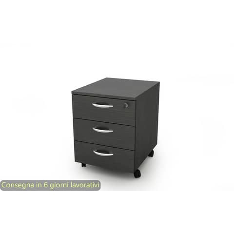 Cassettiera a 3 cassetti su ruote con serratura sul primo cassetto. Nero venato fassino. Guide metalliche. Dimensioni utili cassetti L.31,8 P.38,3 H.10,9 cm fornita in kit da assemblare. Dimensioni: 41x50xH.52,2 cm. Cassettiera con struttura in melaminico bilaminato sp. 16 mm. Ruote pivotanti, smontate e senza freno.