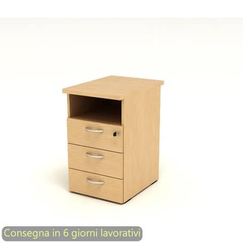 Cassettiera alta della linea Presto, una linea operativa contemporanea progettata per un utilizzo quotidiano ed intensivo in grado di soddisfare tutte le esigenze funzionali ed estetiche. La gamma completa degli elementi permette di allestire ogni ambiente di lavoro, personalizzandolo con stile. Scrivanie con dimensioni conformi alle normative sulla sicurezza dei posti di lavoro in ufficio. Dimensioni L. 43 x P. 60 x H. 72 cm. Cassettierea alte da affiancare alle scrivanie al lato di L80 cm o di L60 cm nelle postazioni compact con sagomatura. Cassetti con guide metalliche e fermo a fine corsa. Cassettiera dotata di un vano a giorno e 3 cassetti di cui il primo con serratura. Piano da 22 mm con bordo antiurto in ABS 3 mm. Materiale melaminico bilaminato antigraffio ed antiriflesso conforme alle norme UNI e EN classe E1. La cassettiera viene venduta e consegnata smontata. In dotazione libretto istruzioni per un semplice montaggio. Produzione certificata conforme alle procedure UNI EN ISO 9001. Certificazioni FSC e PEFC. Colore faggio. Senza ruote.