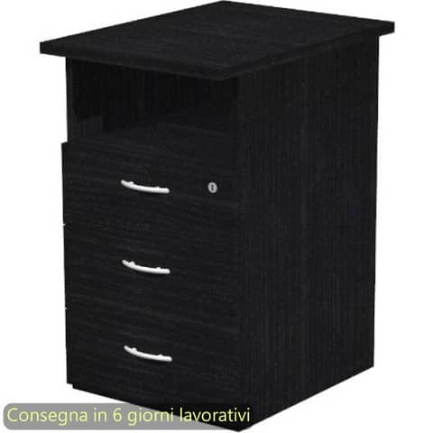 Cassettiera alta della linea Presto, una linea operativa contemporanea progettata per un utilizzo quotidiano ed intensivo in grado di soddisfare tutte le esigenze funzionali ed estetiche. La gamma completa degli elementi permette di allestire ogni ambiente di lavoro, personalizzandolo con stile. Scrivanie con dimensioni conformi alle normative sulla sicurezza dei posti di lavoro in ufficio. Dimensioni L. 43 x P. 60 x H. 72 cm. Cassettierea alte da affiancare alle scrivanie al lato di L80 cm o di L60 cm nelle postazioni compact con sagomatura. Cassetti con guide metalliche e fermo a fine corsa. Cassettiera dotata di un vano a giorno e 3 cassetti di cui il primo con serratura. Piano da 22 mm con bordo antiurto in ABS 3 mm. Materiale melaminico bilaminato antigraffio ed antiriflesso conforme alle norme UNI e EN classe E1. La cassettiera viene venduta e consegnata smontata. In dotazione libretto istruzioni per un semplice montaggio. Produzione certificata conforme alle procedure UNI EN ISO 9001. Certificazioni FSC e PEFC. Colore nero venato frassino. Senza ruote.