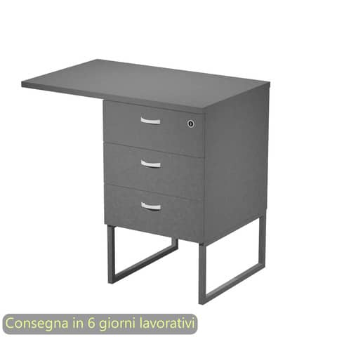 Cassettiera alta a 3 cassetti antracite laguna con Top posizionabile in 2 modi, su supporto in metallo antracite opaco. Fornita montata. Il supporto in metallo – da montare. La serratura si trova sul primo cassetto. I cassetti hanno guide metalliche con fermo a fine corsa. I piedini sono regolabili, in modo da permettere il posizionamento della cassettiera sotto il piano della scrivania. Dimensioni: 80×50/50X80xH.74,4 cm(in base a come viene posizionato il Top). Produzione interna Artexport della parte in legno certificata Iso 9001. Certificazioni FSC e PEFC. Imballi totalmente in cartone per un facile riciclo, a basso impatto ambientale. Consegnata con scocca montata, supporto e top da montare. Senza ruote.