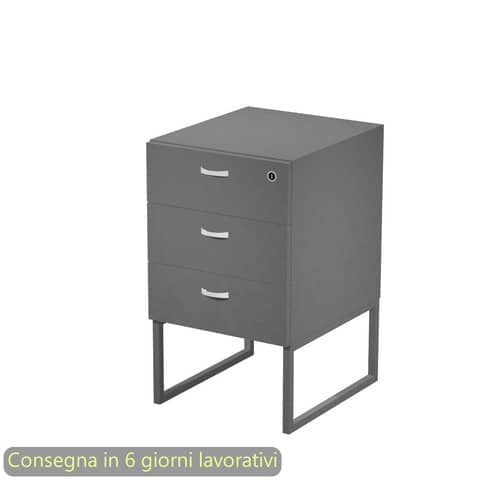 Cassettiera alta a 3 cassetti antracite laguna su supporto in metallo antracite opaco. La serratura si trova sul primo cassetto. I cassetti hanno guide metalliche con fermo a fine corsa. I piedini sono regolabili, in modo da permettere il posizionamento della cassettiera sotto il piano della scrivania. Fornita montata. Il supporto in metallo – da montare. Dimensioni: 41,5x50xH.72,2 cm. Produzione interna Artexport della parte in legno certificata Iso 9001. Certificazioni FSC e PEFC. Imballi totalmente in cartone per un facile riciclo, a basso impatto ambientale. Consegnata con scocca montata, supporto da montare. Senza ruote.