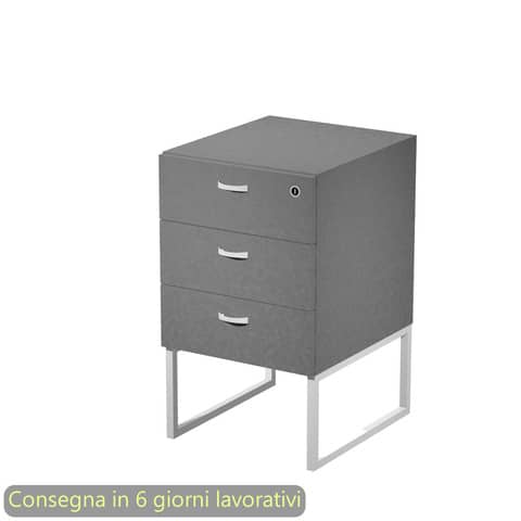 Cassettiera alta a 3 cassetti antracite laguna su supporto in metallo bianco opaco. La serratura si trova sul primo cassetto. I cassetti hanno guide metalliche con fermo a fine corsa. I piedini sono regolabili, in modo da permettere il posizionamento della cassettiera sotto il piano della scrivania. Fornita montata. Il supporto in metallo – da montare. Dimensioni: 41,5x50xH.72,2 cm. Produzione interna Artexport della parte in legno certificata Iso 9001. Certificazioni FSC e PEFC. Imballi totalmente in cartone per un facile riciclo, a basso impatto ambientale. Consegnata con scocca montata, supporto da montare. Senza ruote.