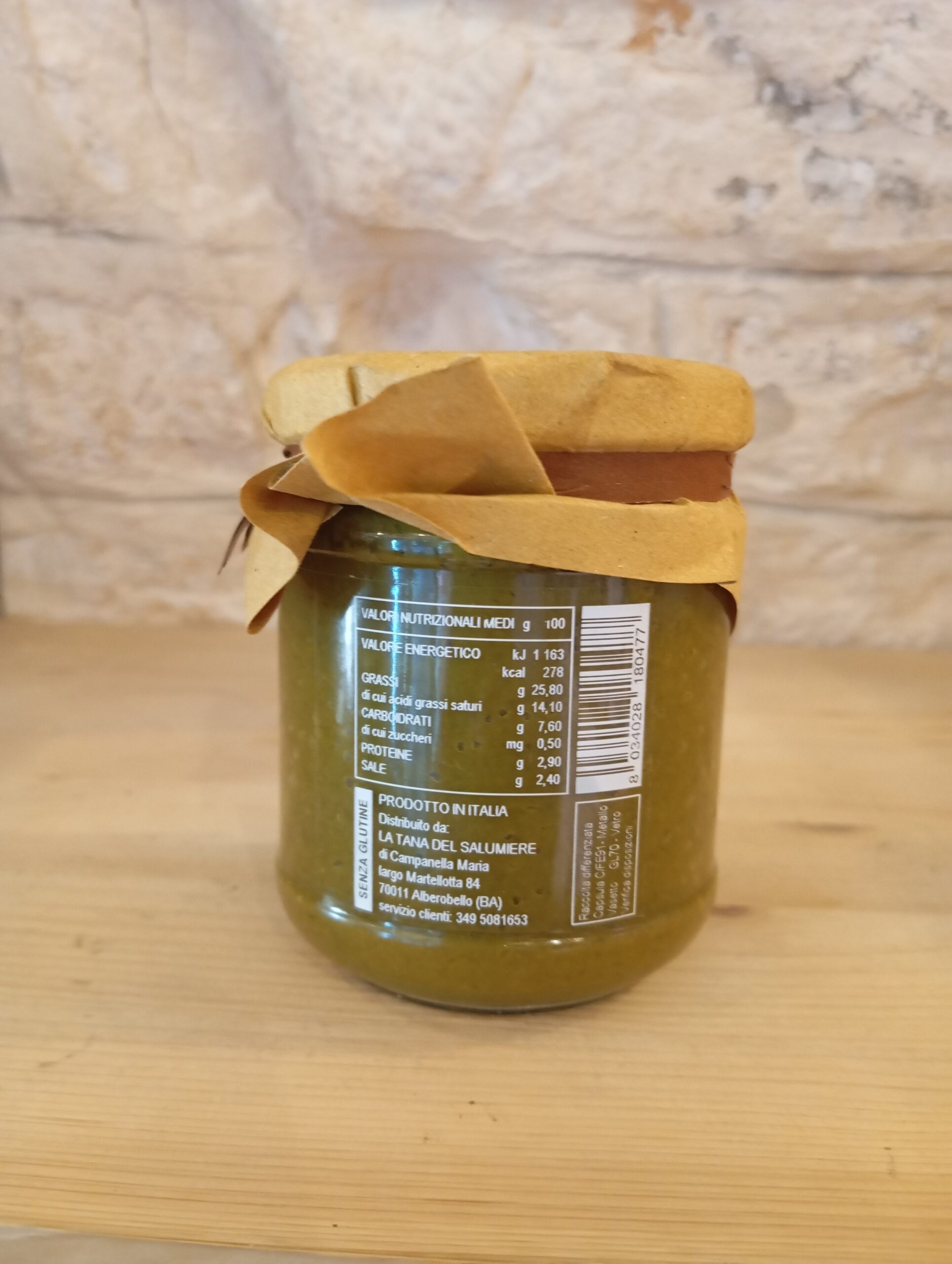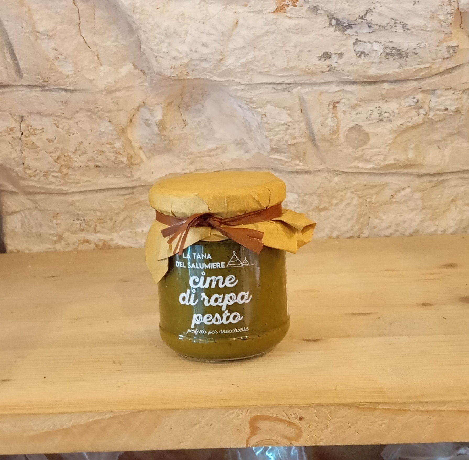 È una salsa pronta a base di cime di rapa, ideale per condire orecchiette, ma anche ottima per preparare lasagne alla pugliese con besciamella, mozzarella e salsiccia.