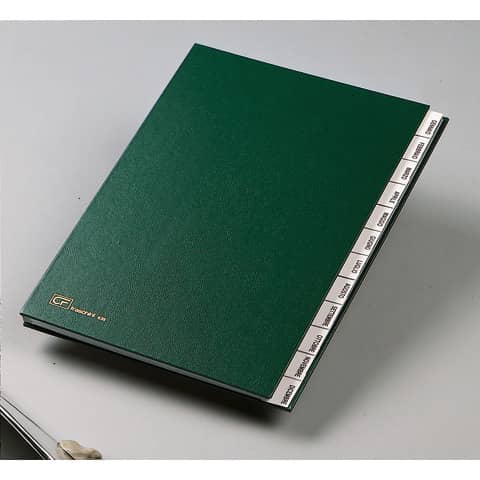 Classificatori mensili gen-dic realizzati in robusta copertina rivestita in similpelle. Interno a scomparti in cartoncino accoppiato e rubrica articolata su scala con lettere in plastica serigrafata. Dorso a soffietto rivestito in tela. Formato 24×34 cm.