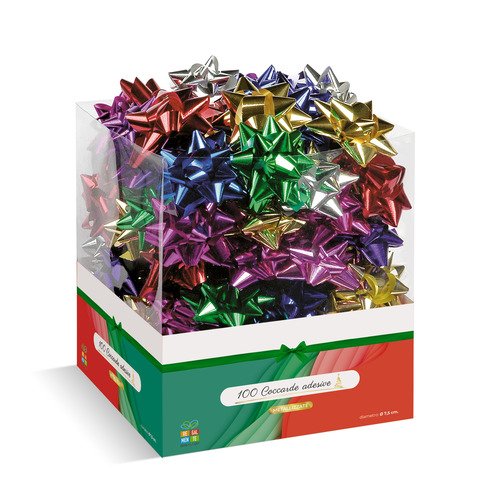 Coccarde adesive in nastro liscio e lucido colorato. Colori assortiti. Diametro 7,5 cm.