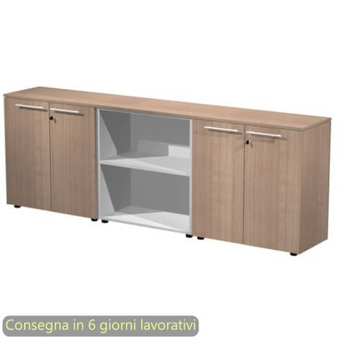 Composizione di tre armadi bassi. Mobile centrale a giorno con ante in melaminico e serratura. Completo di top e fianchi finitura con spessore 14 mm. Colore: ciliegio arabis. Dimensioni: 242,8x43xH.81,4 cm. Produzione interna Artexport della parte in legno certificata Iso 9001. Certificazioni FSC e PEFC. Imballi totalmente in cartone per un facile riciclo, a basso impatto ambientale.