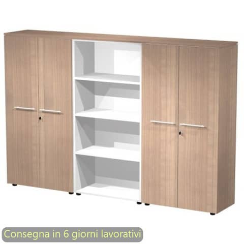 Composizione da tre armadi medio-alti. Mobile centrale a giorno e mobili laterali con due coppie di ante melaminico con serratura. Completo di top e fianchi finitura spessore 14 mm. Colore: ciliegio arabis. Dimensioni: 162,8x43xH.158,2 cm. Produzione interna Artexport della parte in legno certificata Iso 9001. Certificazioni FSC e PEFC. Imballi totalmente in cartone per un facile riciclo, a basso impatto ambientale.