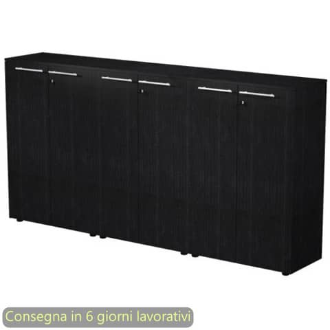 Composizione da tre armadi medi con ante in melaminico con serratuta completa di top e fianchi finitura con spessore 14 mm. Colore: nero venato frassino. Dimensioni: 242,8 x43xH.119,8 cm. Produzione interna Artexport della parte in legno certificata Iso 9001. Certificazioni FSC e PEFC. Imballi totalmente in cartone per un facile riciclo, a basso impatto ambientale.