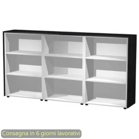 Composizione di tre mobili medi a giorno completi di top unico e fianchi finitura. Colore: nero venato frassino. N?2 ripiani spessore 25 mm regolabili in altezza per mobile. Dietro rifinito in colore grigio alluminio. Piedini livellabili. Top e fianchi finitura spessore 14 mm. Dimensioni: 242,8x43xH.119,8 cm. Produzione interna Artexport della parte in legno certificata Iso 9001. Certificazioni FSC e PEFC. Imballi totalmente in cartone per un facile riciclo, a basso impatto ambientale.