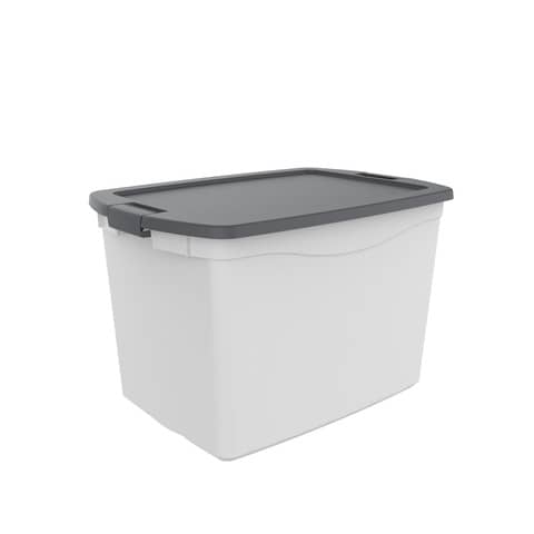 Contenitore realizzato al 100% con plastica riciclata. Capacit? 80L, dotato di chiusura con coperchio con clip e pratiche impugnature laterali per un facile trasporto. Contenitore impilabile colorazione grigio chiaro/scuro.