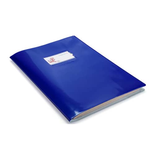 Copertina in PVC accoppiato laccato colorato (300 micron), con alette salva angoli e tasca portanome saldata. Formato 21 x 30 cm, colore blu. Confezione composta da 25 copertine.