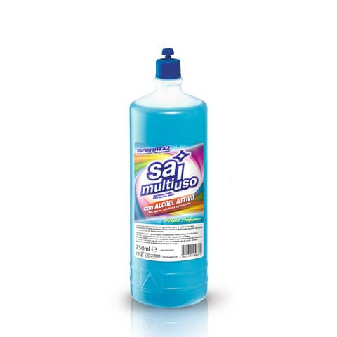 SAI MULTIUSO detergente per superfici dure con alcool attivo. Ideale per tutte le superfici lavabili. Rapido, efficace, non occorre risciacquare. Sgrassa, brilla e non lascia aloni. Formato: 0,75L. Distribuire direttamente il prodotto sulle superfici da pulire e passare con un panno asciutto. Ideale per pulire a fondo vetri, piastrelle, e tutte le superfici lavabili. Composizione chimica: inf. 5% tensioattivi anionici. Ph: 6,5-7,5. Densit?: 0,985 + 0,05 g/ml. Colore: blu. Odore: fresco profumo.