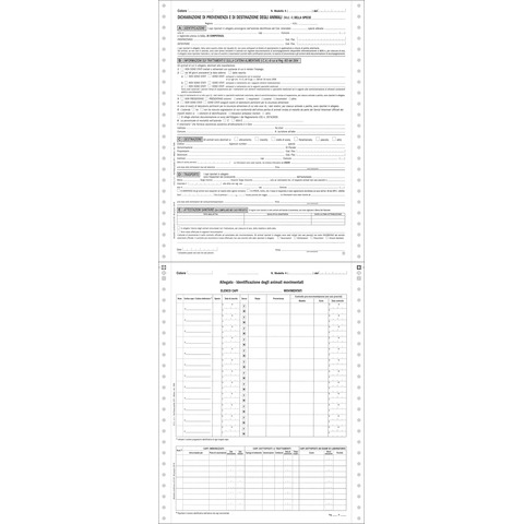 Mod. 4 – ( Bianco-8870R0000 ) Dichiarazione di provenienza degli animali da allevamenti – modulo continuo a 4 copie – carta chimica. Il nuovo modello non – più riconoscibile per la stampa colorata ma sar? il compilatore a scrivere sullo stesso il colore che identifica il tipo di provenienza/destinazione ( Rosa: da allevamenti – Giallo: da centri di raccolta, fiere, mercati o esposizioni – Verde: da stalle di sosta). Il nuovo modello sostitusce anche il documento di accompagnamento al macello di volatili, conigli, selvaggina d’allevamento.