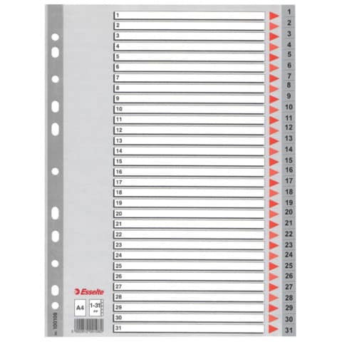 Pagina indice in cartoncino e divisori in polipropilene da 115 ?. Tasti a scalino con i numeri stampati in nero. Rinforzi in mylar sul lato forato. Il modello Maxi consente di classificare documenti contenuti in buste a perforazione universale. Tasti numerici da 1 a 31. PP. Formato A4. Grigio.