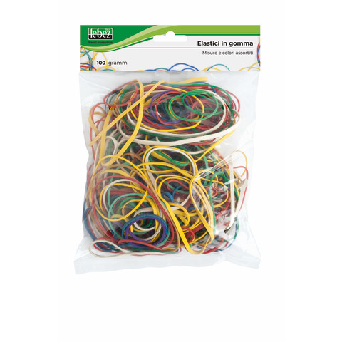 Elastici in gomma colorata in misure assortite. Busta appendibile da 100 g.