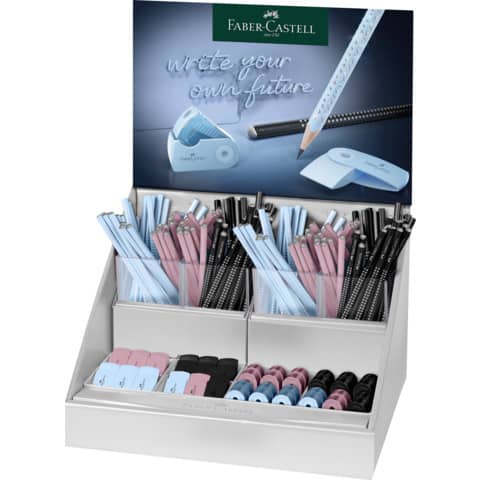 Espositore con matite di grafite Standard con accessori. La vernice perlata e il cappuccio glitter non passano inosservati; mina resistente alla rottura grazie allo speciale processo di incollaggio SV; forma triangolare ergonomica;?pregiata gomma per cancellare Sleeve; custodia protettiva dallo sporco; temperamatite Sleeve mini per tutte le matite dalle forme più diffuse delle linee Standard; con contenitore per trucioli per temperare più comodamente e senza sporcare. Assortiti in 3 colori: nero, azzurro e rosa.