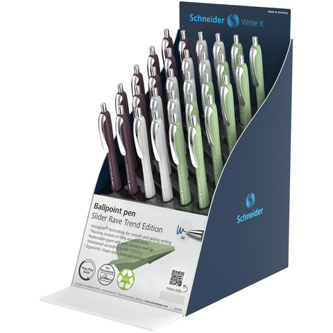 La Slider Rave di Schneider – la penna a sfera a scatto che unisce innovazione e comfort per una scrittura estremamente scorrevole e leggera. Grazie alla tecnologia Viscoglidè, offre un flusso d?inchiostro uniforme con un consumo ridotto, garantendo una lunga durata. L?inchiostro si asciuga rapidamente, anche su carta liscia, ed – resistente al passaggio dell?evidenziatore. Dotata di refill intercambiabile Slider 755 con punta extralarga, assicura una scrittura fluida e precisa. Il fusto ergonomico con superficie gommata assicura una presa comoda e rilassata. L?inchiostro nero e blu – indelebile secondo la norma ISO 12757-2, mentre il rosso non – certificato. Espositore composto da 30 pezzi: fusto avorio, prugna e verde oliva. Tatto XB. Colore scrittura blu.