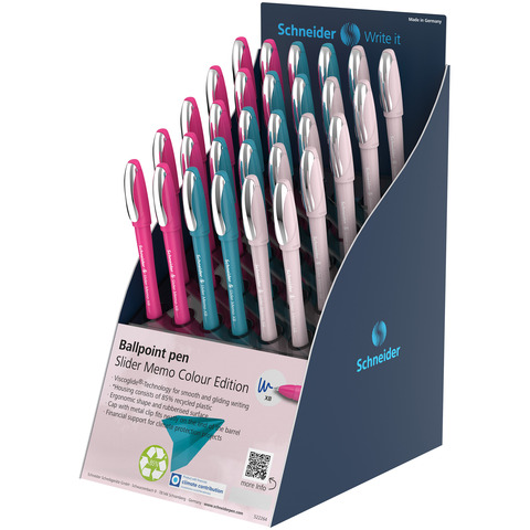 L?innovazione Schneider offre un?esperienza di scrittura straordinariamente leggera e scorrevole grazie alla tecnologia Viscoglidè. Le penne a sfera Slider Memo offrono un inchiostro scorrevole che garantisce un consumo ridotto e una lunga durata. L?inchiostro si asciuga rapidamente, anche su carta liscia, ed – resistente al passaggio dell?evidenziatore. Il design ergonomico con impugnatura gommata assicura una postura rilassata della mano senza affaticamento. Il corpo – realizzato per l?85% in plastica riciclata, unendo qualità e rispetto per l?ambiente. Disponibile in più colori, – perfetta per chi cerca prestazioni elevate e sostenibilità . Espositore da 30 pezzi con inchiostro blu e fusti rosa, fucsia, turchese. Tratto XB. Colore di scrittura blu.