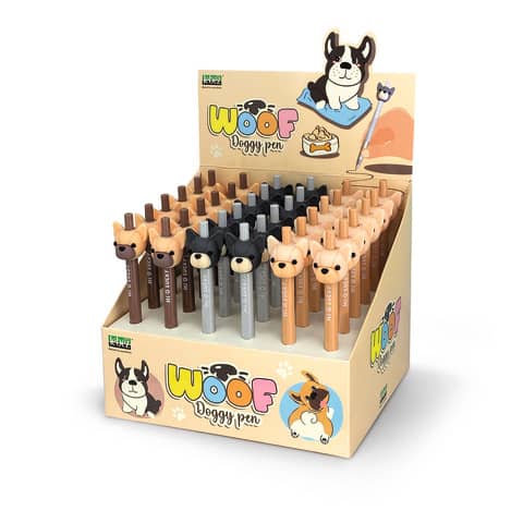 Espositore da banco composto da 36 penne a scatto Woof Doggy Pen. Disponibili in 3 soggetti assortiti.