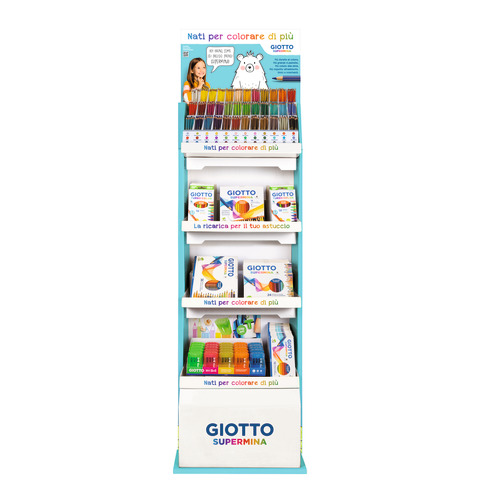 Espositore Giotto. Contenuto: Giotto Supermina monocolore – assortimenti di nr. 34 colori; NEW – F073400 – Giotto Turbocolor in astuccio da 18 colori – nr.14 pezzi; Giotto Supermina astuccio da 12 colori – nr.20 pezzi (F235700); Giotto SuperMina astuccio da 18 colori + 2 Matite Lyra Temagraph – nr.15 pezzi (F23630000); Giotto SuperMina astuccio da 24 colori – nr.15 pezzi (F235800); Giotto SuperMina astuccio da 36 colori – nr. 5 pezzi (F235900); Giotto Temperamatite 3in1 – nr.30 pezzi (F232100).