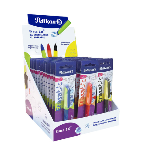 Eraseble 2.0 penna cancellabile ergonomica. Inchiostro gel premium quality, design ergonomico e soft grip. Cancellazione senza residui. Punta media 0.7 mm. Tre colori di scrittura: nero, blu e rosso. Il colore dell?inchiostro – lo stesso del fusto. Refill universale. Espositore composto da: 60 penne roller (36 blu – 6 nere – 18 rosse) e 36 blister da 2 refill (18 blu – 6 nero – 12 rosso).