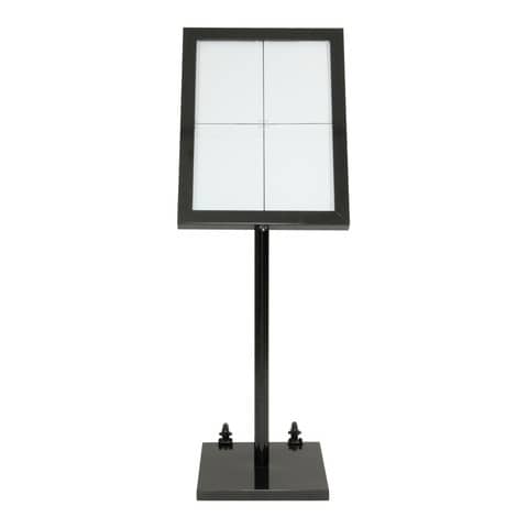 Espositore in acciaio 4xA4 rivestito in colore nero. Contiene 48 Led a luce bianca. Lastra di metallo nero all’interno rimovibile per un facile inserimento e rimozione dei fogli. Vetro di sicurezza. Display posizionabile sia in orizzontale che in verticale. Utilizzabile sia all’interno che all’esterno. Pu? essere montato a parete o utilizzato con piantana (compresa). All’interno – compreso anche cavo alimentatore da 5m e una serratura di sicurezza con 2 chiavi. Ruote carrello escluse. Possibilit? di adoperarlo in modalità wireless acquistando a parte 1 batteria al litio ricaricabile.